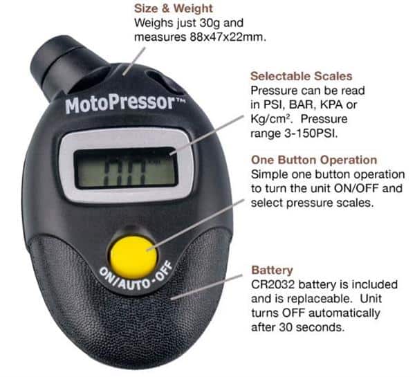 The Motopressor Digital Tyre Gauge is designed to help you save money and maximize the life of your tyres. This device is equipped with four pressure scale selections – PSI, BAR, KPA and Kg/Cm2. Select the appropriate pressure scale, press the gauge onto the valve of your tyre, remove it and read the pressure. The pressure will display for 10 seconds before resetting to 0. An automatic shutoff feature ensures the batteries don’t drain unnecessarily.